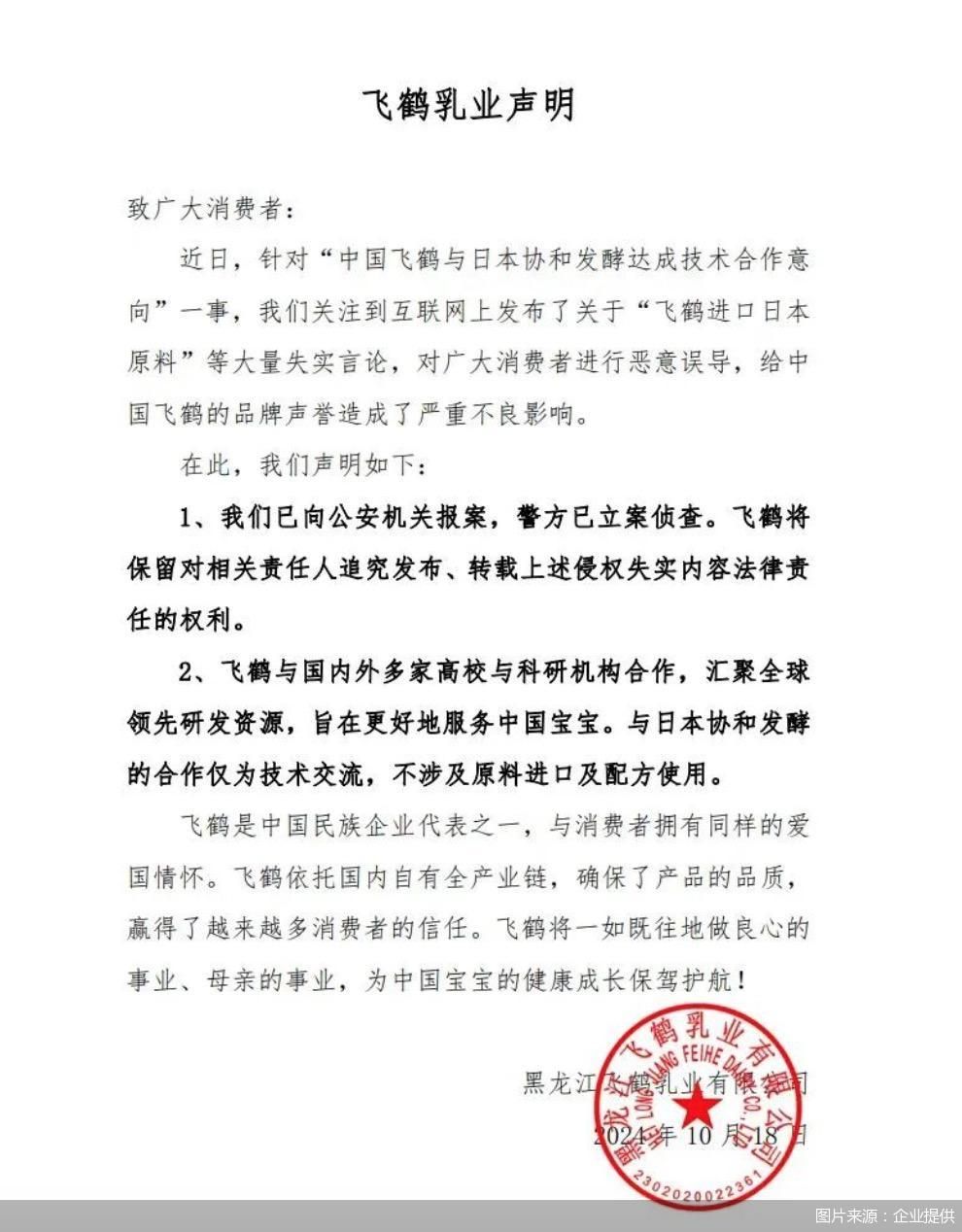 讯(记者孔文燮)10月18日,黑龙江飞鹤乳业有限公司(以下简称“飞鹤”)通过官方渠道发表声明称,近日,互联网上出现了关于“飞鹤进口日本原料”等大量失实言论,这些言论不仅误导了消费者,还对飞鹤的品牌声誉造成了严重不良影响。飞鹤已经向公安机关报案,警方已经立案侦查。