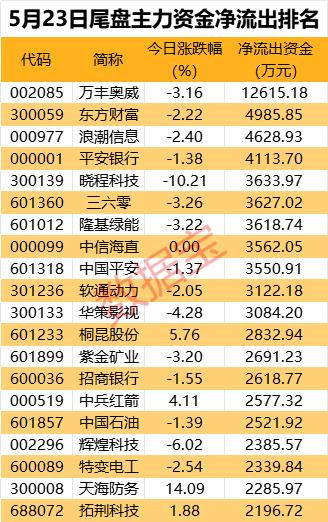 尾盘11股主力资金净流出超3000万元。万丰奥威尾盘净流出金额最高,为1.26亿元。东方财富、浪潮信息、平安银行净流出均超4000万元。