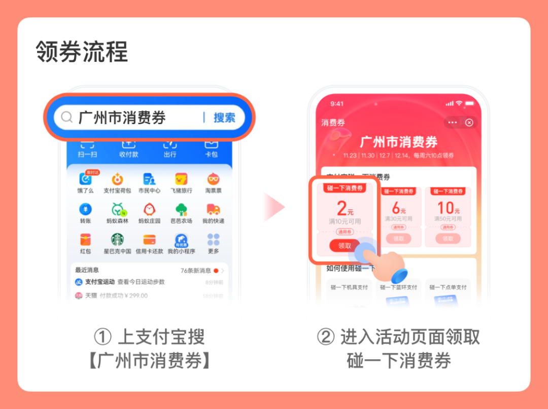 据介绍,“碰一下消费券”将在连续四个星期的周六发放,首轮于11月23日周六上午10点开启(先到先得,领完为止)。广州用户上支付宝App搜“广州市消费券”,领取后在市内所有接入“碰一下”支付的商家门店消费均可直接抵扣。