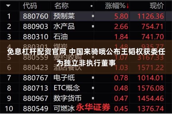中国来骑哦(08039)发布公告,自2024年9月4日起生效:黎碧芝女士已辞任独立非执行董事,并不再担任公司审核委员会主席、提名委员会成员及薪酬委员会成员;王韬权先生获委任为公司独立非执行董事、薪酬委员会主席、审核委员会及提名委员会各自的成员。 【免责声明】本文仅代表作者本人观点免息杠杆配资官网,与和讯网无关。和讯网站对文中陈述、观点判断保持中立,不对所包含内容的准确性、可靠性或完整性提供任何明示或暗示的保证。请读者仅作参考,并请自行承担全部责任。邮箱:news_center@staff.he...